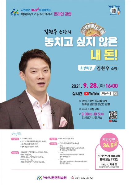 [충청뉴스큐] 아산시는 오는 25일 김현우 소장의 ‘놓치고 싶지 않은 내 돈’이란 주제로 행복아산 시민아카데미 3회차 특강을 실시한다.
