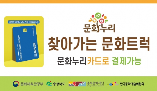 찾아가는 문화트럭 사업은 충북문화재단이 문화누리카드 사용이 어려운 지역을 직접 방문해 주방, 전자, 운동용품 등 각종 가맹점 상품을 판매하는 사업으로 해당 카드 소지자라면 누구나 구입할 수 있다.