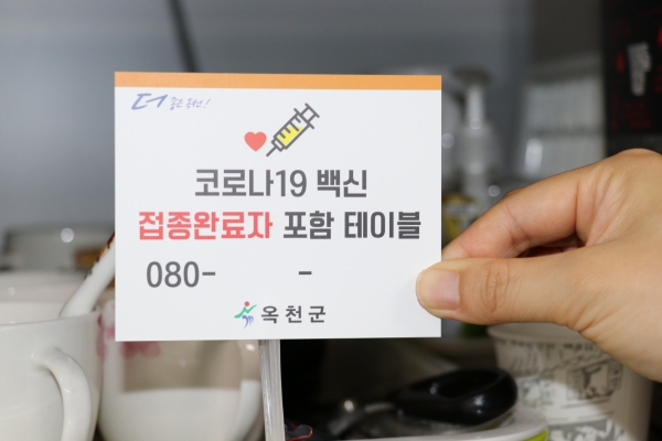 [충청뉴스큐] 옥천군은 코로나19 사회적 거리두기 3단계 적용으로 사적 모임 기준이 변경됨에 따라 지역주민들의 혼란을 방지하기 위해 백신 예방접종 완료자가 포함된 테이블임을 알리는 표지판을 제작해 배부한다.