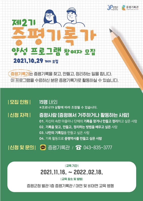 [충청뉴스큐] 증평군이 제2기 증평기록가 양성 프로그램 참여자를 다음 달 29일까지 모집한다.