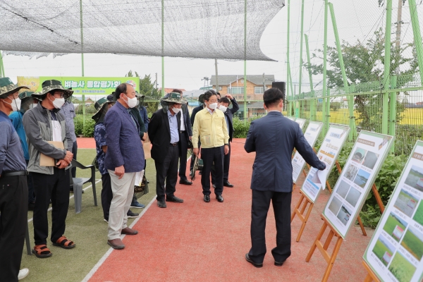 [충청뉴스큐] 당진시농업기술센터는 27일 우강면 대포리에 위치한 벼농사 종합시범단지에서 김홍장 당진시장을 비롯한 시범사업 수행 농업인 및 관계자 등 40여명이 참석한 가운데 올해 벼농사를 평가·분석하는 ‘벼농사 종합평가회’를 개최했다.