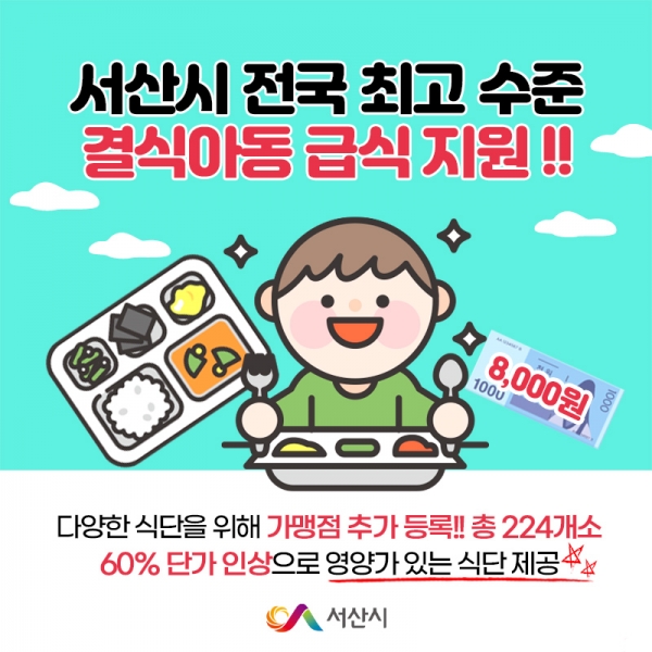 맹정호 서산시장은 “급식이 필요한 아동에게 단가 인상으로 영양가 있는 식단을 제공할 수 있게 됐다”며 “앞으로도 실속있고 차별화된 지원방안을 발굴하고 실현해가겠다”고 말했다.