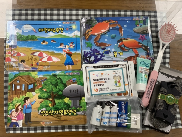 인지꾸러미는 보령을 상징하는 대천해수욕장, 성주산자연휴양림, 꽃게 등을 퍼즐로 제작한 싱글벙글 기억 퍼즐과 위생키트 등 건강용품 4종으로 구성됐다.