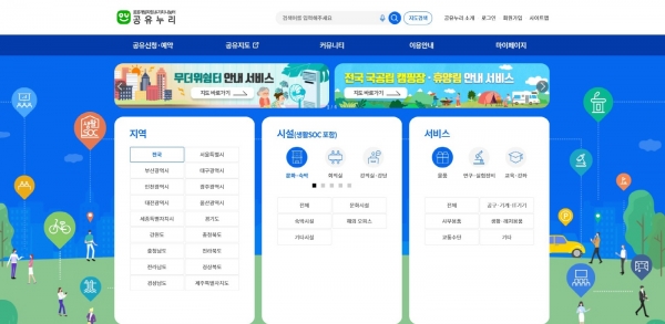 ‘공유누리’는 중앙행정기관과 지방자치단체, 공공기관이 보유한 시설이나 물품 등을 주민에게 개방하고 누구나 검색해 예약·이용할 수 있도록 정부에서 운영하고 있는 대국민 공공개방자원 공유서비스 포털이다.