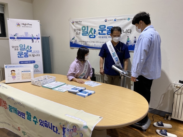8일 보건소에서 열린 캠페인에는 운동처방사와 간호사가 옥천군 접종센터 방문객 대상으로 비만도 측정 및 비만상담을 진행했다.