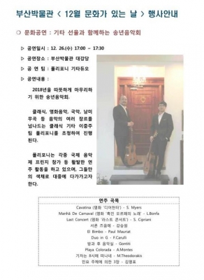 [충청뉴스큐] 부산시 시립박물관에서는 오는 26일 오후 5시 시립박물관 대강당에서 클래식기타 듀오 폴리포니를 초청하여 문화공연 ‘기타 선율과 함께하는 송년음악회’를 펼친다고 밝혔다.