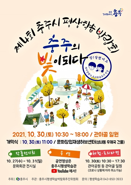 [충청뉴스큐] 충주시는 오는 30일 관아골 일원에서 ‘충주의 빛이 되다 평생학습 우수 도시 충주’라는 주제로 제4회 충주시평생학습박람회를 온·오프라인 병행 개최한다고 밝혔다.