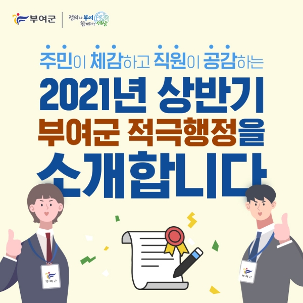[충청뉴스큐] 부여군은 주민이 체감하고 직원이 공감하는 적극행정을 추진하기 위해 2021년 상반기 적극행정 우수사례 및 우수공무원을 선발했다고 밝혔다.