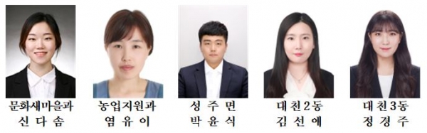 대천3동 정경주 주무관은 정기적인 제초작업과 교통 시설물 관련 민원의 신속한 처리로 쾌적한 도시 미관을 조성했으며 새벽시간을 이용한 체납차량 번호판 영치활동으로 지방세수 증대에 기여한 공로가 인정됐다.
