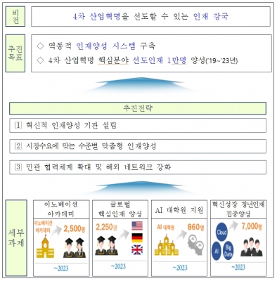그리고 이를 달성하기 위한 세부과제로 이노베이션 아카데미, 글로벌 핵심인재 양성, 인공지능 대학원 지원, 혁신성장 청년인재 집중양성사업을 본격 추진한다.