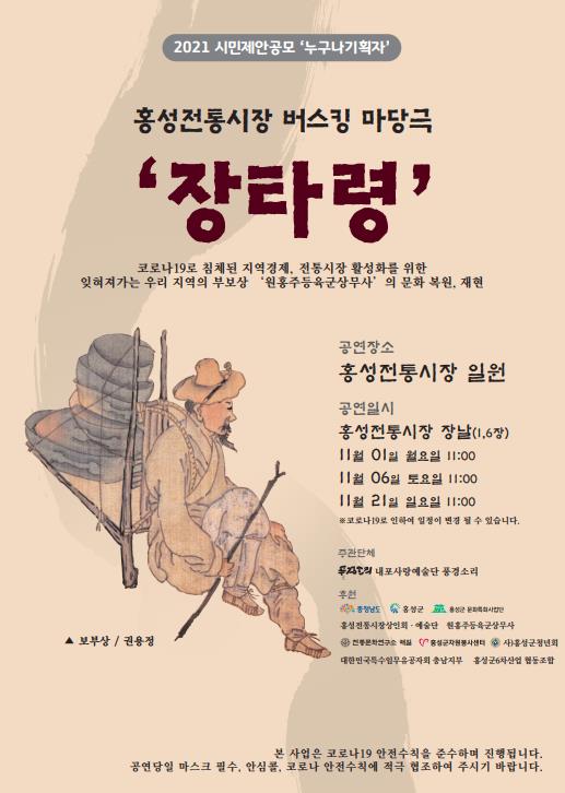 [충청뉴스큐] 홍성군은 전통시장 활성화와 우리지역의 보부상 문화인 ‘원홍주육군상무사’의 가치를 널리 알리기 위해 홍성전통시장 버스킹 마당극 ‘장타령’공연을 오는 11월 6일 21일 11시부터 12시까지 개최한다.