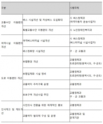 추진과제는 버스시설개선 및 저상버스 도입확대, 특별교통수단 이동편의개선, 여객버스터미널 시설개선, 버스정류장 시설개선, 보행환경개선, 보행입체화시설 정비, 교통약자 주차구획 운영, 보호구역 개선사업, 교통약자 안전홍보강화, 협의체 구성·운영 등이다.