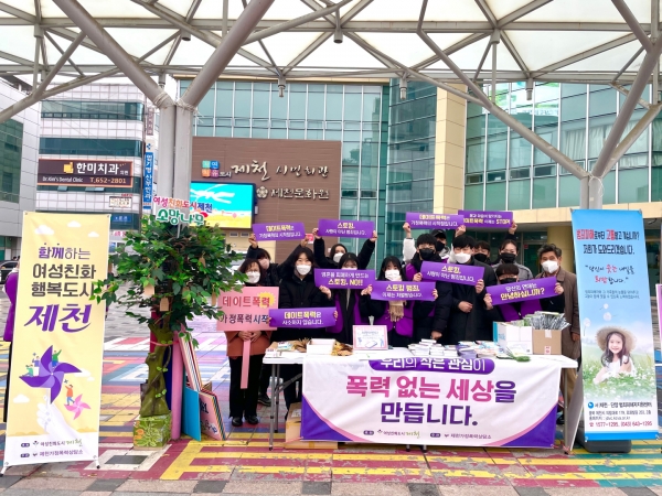 [충청뉴스큐] 제천가정폭력상담소는 지난 10일 시민회관 광장에서 제천경찰서 여성청소년과, 제천·단양범죄피해자지원센터, 세명대학교 법학과 동아리 팔레트와 함께 여성친화도시제천 홍보 캠페인을 실시했다.