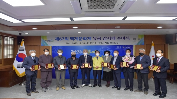[충청뉴스큐] 부여군은 지난 10일 제67회 백제문화제 제례·불전 봉행 및 자원봉사단체를 중심으로 백제문화제의 발전에 이바지한 공로를 격려하기 위한 감사패를 수여했다.