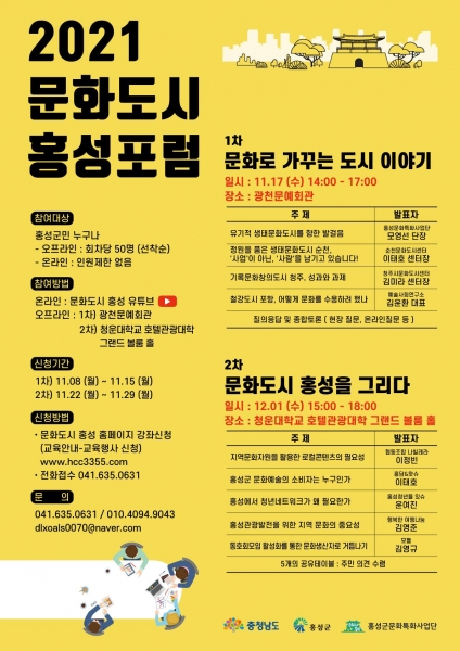 [충청뉴스큐] 홍성군문화특화사업단은 군민의 의견을 반영한 실효성 있는 문화도시 조성계획을 수립하기 위해 11월 17일 12월 1일 양일에 걸쳐, ‘2021 문화도시 홍성포럼’을 개최한다.