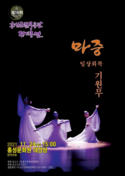이어 홍성군립무용단의 제16회 정기공연 ‘마중,일상회복 기원무’가 11월 24일 오후 3시 홍성문화원 대공연장에서 펼쳐진다.