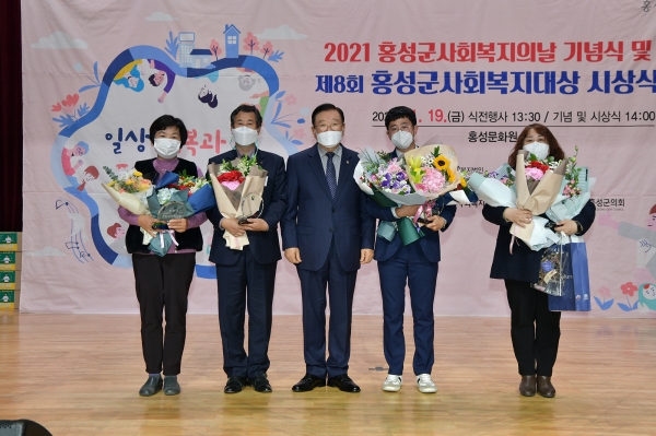 [충청뉴스큐] 홍성군은 지난 19일 홍성문화원에서 사회복지에 대한 군민의 이해 도모와 지역사회복지 증진을 위해 최선을 다하고 있는 사회복지인들의 소통과 화합을 위해 2021년 사회복지의 날 기념식 및 제8회 홍성군 사회복지대상 시상식을 개최했다.
