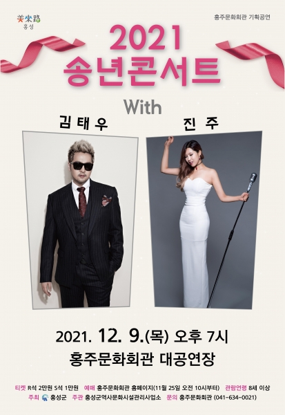 [충청뉴스큐] 홍성군은 코로나19 일상 회복을 기원하며 군민들에게 희망을 드리고 음악을 통해 2021년을 마무리하는 힐링의 시간과 따뜻한 송년을 함께 보낼 수 있도록 ‘2021 송년 콘서트 with 김태우, 진주’를 오는 12월 9일 저녁 7시에 개최한다.