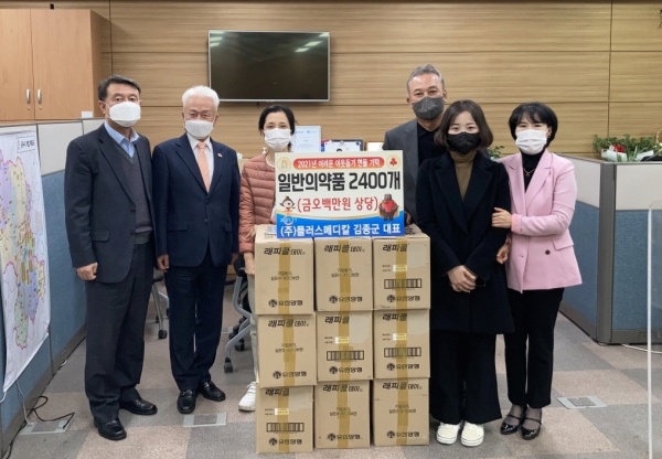 ㈜플러스메디칼 김종군 대표는 이날 시청을 방문해 우전희 경로장애인과장을 만나 종합감기약 9박스, 2,400개를 기탁했다.