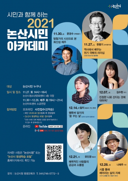 한편 2021년 논산시민아카데미는 12월까지 매주 화요일 저녁 7시, 총 6회에 걸쳐 시민과 함께하는 수준 높은 인문학 강좌를 제공할 계획이며 문경수 과학탐험가 김수현 작가 달지 유튜버 유인경 방송인 나태주 시인 등 각 분야 저명인사들의 명품 강연이 이어진다.