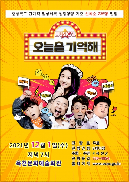 [충청뉴스큐] 옥천군은 오는 1일 오전 10시와 저녁 7시, 문화예술회관에서 코미디뮤지컬 ‘오늘을 기억해’를 공연한다고 25일 밝혔다.