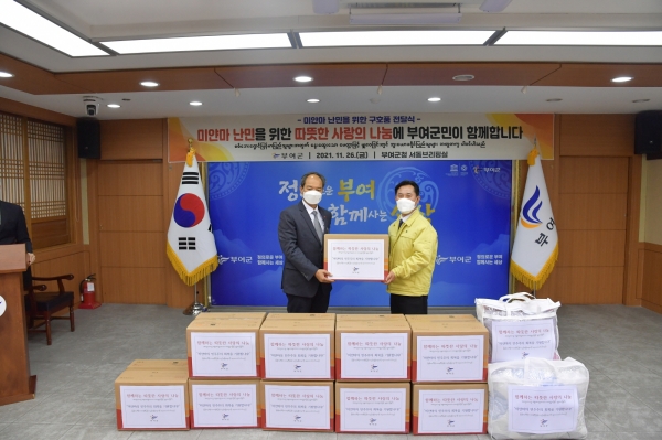 [충청뉴스큐] 부여군은 지난 26일 부여군청 서동브리핑실에서 미얀마 난민을 위한 구호품 전달식을 가졌다.