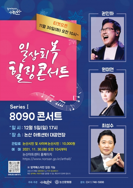 논산시가 오는 12월 5일 일요일 저녁 7시 논산아트센터 대공연장에서 ‘일상회복 힐링콘서트#1 8090’을 개최한다.