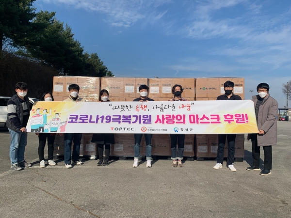 이번에 기탁된 마스크는 ㈜톱텍에서 후원받은 것으로 군은 이번에 전달받은 마스크를 지역 내 사회복지시설 및 읍면 저소득층 등에 전달할 예정이다.