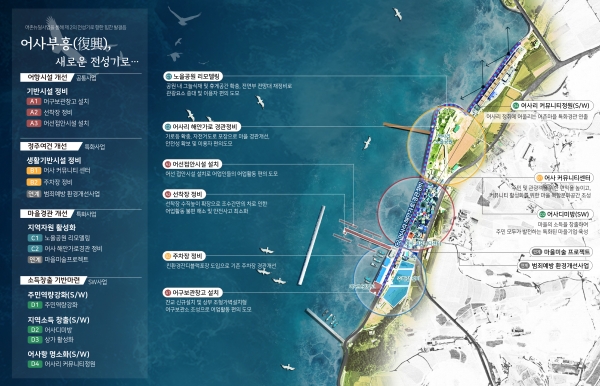 군에 따르면 2020년 궁리항을 시작으로 2021년 죽도항과 2022년 어사항까지 어촌뉴딜 300사업에 3년 연속 선정됨에 따라 전국 최초 에너지자립섬인 죽도와 함께 해양관광사업의 세 축이 맞물려 시너지 효과를 낼 것으로 기대되고 있다.