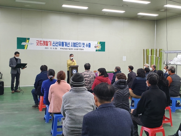 부여군 대표 딸기 작목회인 싱싱딸기연합회는 지난 6일 서부여농협 유통센터에서 회원농가, 기관단체장 등 20명이 참석한 가운데 부여 굿뜨래딸기 첫 수출 기념행사를 치렀다.