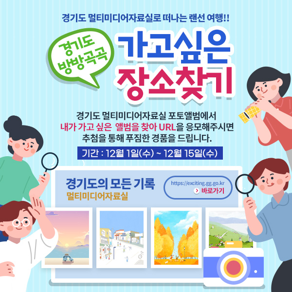 ‘2021년 경기도 방방곡곡 가고싶은 장소 찾기’ 이벤트는 누구나 참여할 수 있으며 온라인 링크로 접속해 멀티미디어자료실 포토앨범에 올라간 사진 중 가장 가고 싶은 곳의 페이지 URL, 이름, 연락처를 기입해 제출하면 된다.