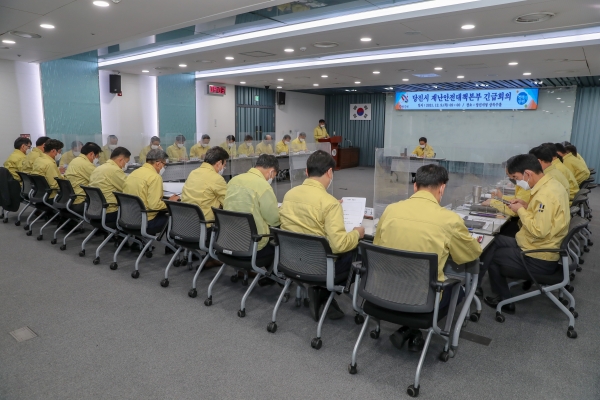 [충청뉴스큐] 김홍장 당진시장은 9일 오전 14개 읍면동장이 참석한 가운데 재난안전대책본부 회의를 긴급 개최, 코로나19 확산에 따른 방역체계 재편을 지시했다.