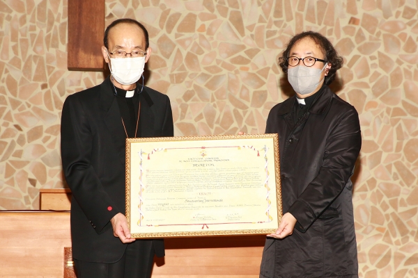 이날 올해 2월 교황청으로부터 전달된 ‘국제성지 승인 교령’을 김종수 대전교구장 서리 주교가 한광석 해미국제성지 담당신부에게 전달했다.