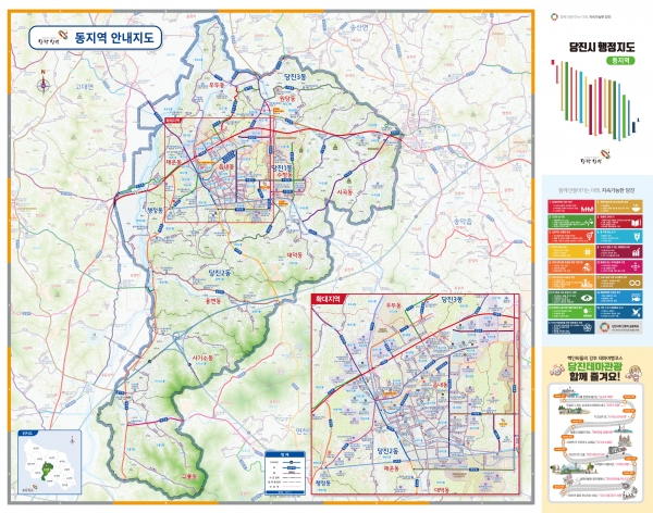 행정지도 앞면에는 행정구역 경계 및 도로 등 지형지물 행정복지센터, 체육시설, 관광시설, 복지 및 편의시설 등의 공공기관과 주요시설을, 뒷면에는 읍·면·동 소재지별 중심도, 당진 테마 관광 9선, 17개의 당진시 지속가능발전 목표를 담았다.
