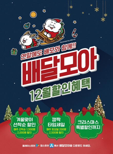 시는 크리스마스 기간인 12월 24일부터 26일까지 배달모아를 통한 주문 시 선착순 1,225명에게 7천원을 즉시 할인해주는 이벤트를 진행할 예정으로 이번 할인행사를 통해 배달모아 이용객들에게 좀 더 따뜻한 연말을 안겨줄 전망이다.