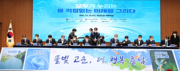 충남도청 대회의실에서 열린 협약식에는 한정애 환경부장관, 양승조 충남도지사, 이상진 금강유역물관리위원장, 박재현 K-water사장, 김동일 보령시장, 맹정호서산시장, 김홍장 당진시장, 노박래 서천군수, 김돈곤 청양군수, 김석환홍성군수, 황선봉 예산군수, 가세로 태안군수가 참석했다.