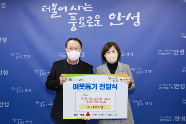 [충청뉴스큐] ㈜에코조인은 지난 28일 안성시를 방문해, 코로나19 방역물품으로 항바이러스 스프레이 700개를 기탁했다.