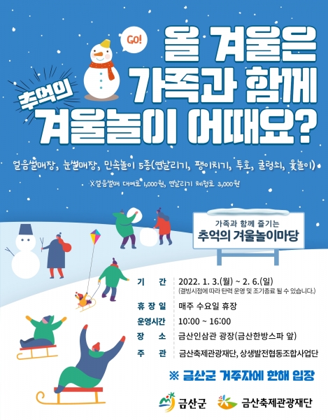 [충청뉴스큐] 금산군은 1월 3일부터 2월 6일까지 관내 어린이와 청소년들의 야외 즐길거리를 제공하기 위해 금산인삼관 광장에서 ‘추억의 겨울놀이마당’을 개최한다.