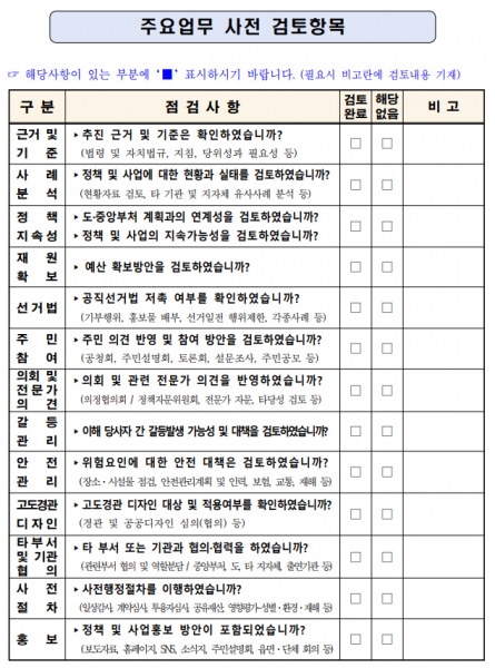 이 제도는 신규사업 및 중요사업 등 주요정책 입안 중 발생하는 행정착오를 예방하기 위해 계획수립단계 시 근거 및 기준 사례분석 정책 지속성 재원 확보 공직선거법 주민참여 의회 및 전문가 의견 갈등관리 안전관리 고도경관 디자인 타부서 및 기관협의 사전절차 홍보 등 13개 분야에 대해 기안자가 사전 검토해 체크리스트를 작성하고 지속 관리하기 위해 마련됐다.