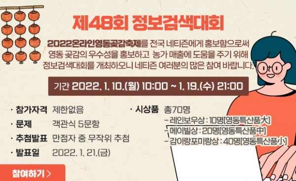 군은 영동군의 대표 축제인 ‘2022 온라인 영동곶감축제’와 명품 영동곶감을 전국 네티즌에게 알리고자 행사를 마련했다.