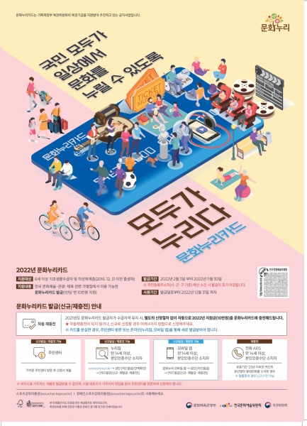 신규 대상자들은 2월 3일부터 11월 30일까지 가까운 읍·면사무소나 ‘문화누리카드’ 누리집에서 카드를 발급받을 수 있다.