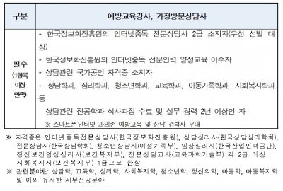 응시자격은 한국정보화진흥원이 시행하는 인터넷 중독 전문상담사 2급 자격증 등 상담관련 자격증 소지자, 상담관련 전공 학위를 취득한 경력자 등이다.
