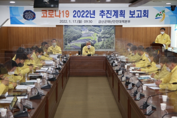 [충청뉴스큐] 금산군은 지난 17일 문정우 금산군수의 주재로 코로나19 2022년 추진계획 보고회를 개최하고 올해 방역행정 내실화 및 취약요인 관리, 포스트 코로나 대비 등에 관해 논의했다.