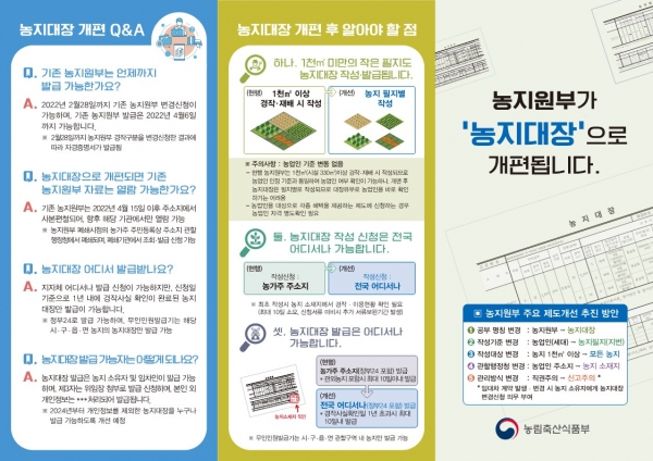 또한 오는 2월 28일까지 농지원부 수정 신청 접수 후 기존 농지원부를 재정비해 4월 15일까지 농지대장으로 전환을 완료할 계획이며 기존 농지원부는 4월 6일까지 발급되고 이후 농가주 주소지에서 사본 편철돼 10년간 보관된다.