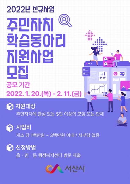 24일 시에 따르면 모집기한은 2월 11일까지며 주민자치에 관심 있는 5인 이상의 모임 또는 단체면 누구나 지원 가능하다.