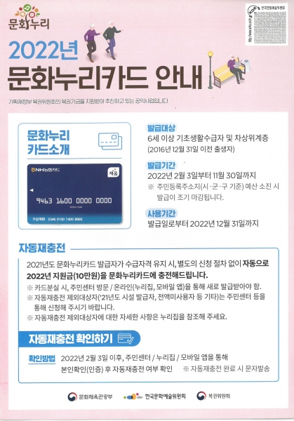 지난해까지 발급·등록했던 카드 보유자는 1월 21일까지 자동으로 10만원씩 재충전되며 작년 말 기준 문화누리카드 전액 미사용자는 재충전 대상에서 제외되어 2월 3일부터 해당 읍면행정복지센터에서 개별 신청해야 한다.