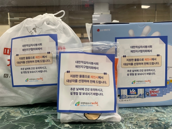 지원물품은 충북 적십자사에서 지원받은 방역키트 350여개, 적십자봉사회 제천지구협의회에서 지원받은 방한키트 90여개와 핫팩 150여개 등이며 대상은 시장 노점상, 아파트 경비원, 주차요금 징수원 등 매서운 겨울 날씨에도 불구하고 바깥에서 땀 흘리는 근로자로 설 명절 이전에 배부할 계획이라고 전했다.