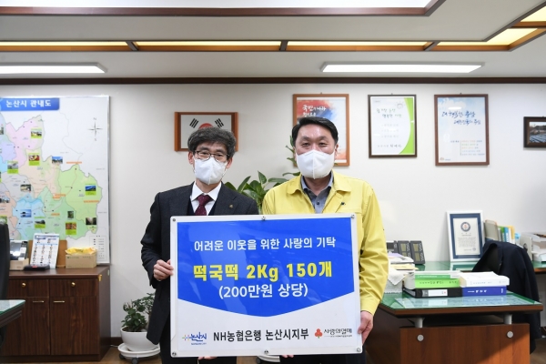 이명렬 NH농협은행 논산시지부장은 2백만원 상당의 떡국 떡 2kg 150개를 기부했으며 설 명절을 맞아 관내 지역아동센터 및 어려운 이웃들을 위해 전달될 예정이다.