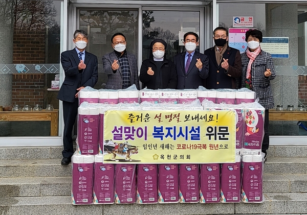 [충청뉴스큐] 옥천군의회 의원들이 설날을 맞아 28일 관내 요양시설과 사회복지시설인 옥천꽃동네성모노인요양원과 영실애육원을 방문해 위문품을 전달하는 등 나눔과 사랑을 실천했다.