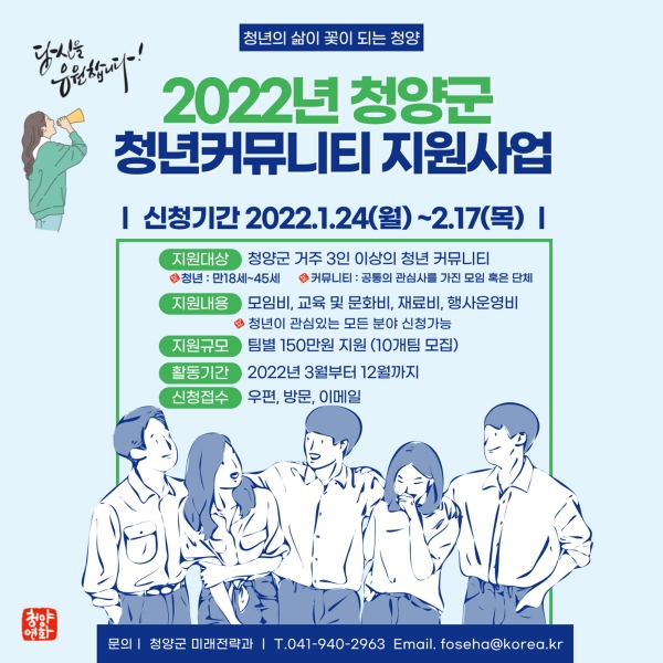 [충청뉴스큐] 청양군이 2월 17일까지 청년 커뮤니티 지원사업 참여 단체 10곳을 모집한다고 28일 밝혔다.